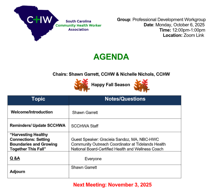 Join us for the SCCHWA Professional Work Group's virtual monthly meeting, a platform for enhancing skills, fostering collaboration, and driving innovation within the community health sector. This recurring event brings together professionals dedicated to improving health outcomes and addressing disparities in underserved communities from the comfort of your home or office.
