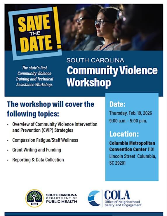 Organizado por el Departamento de Salud Pública de Carolina del Sur (DPH) y la Oficina de Seguridad y Participación Vecinal (ONSE) de la ciudad de Columbia, este taller reunirá a profesionales del CVIP, profesionales de la salud pública, fuerzas del orden y otras organizaciones comunitarias comprometidas con abordar las causas fundamentales de la violencia comunitaria.
