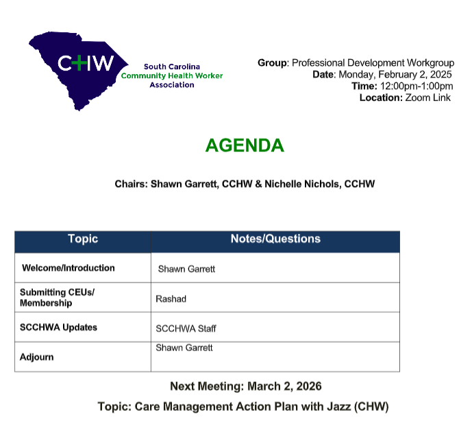 El Grupo de Trabajo de Desarrollo Profesional de la Asociación de Trabajadores Comunitarios de Salud de Carolina del Sur (SCCHWA) se compromete a dotar a nuestros miembros de las habilidades, los conocimientos y los recursos necesarios para destacar en sus funciones. Nuestra misión es fomentar un entorno colaborativo en el que los trabajadores comunitarios de salud puedan compartir experiencias, aprender unos de otros y mejorar sus capacidades profesionales.